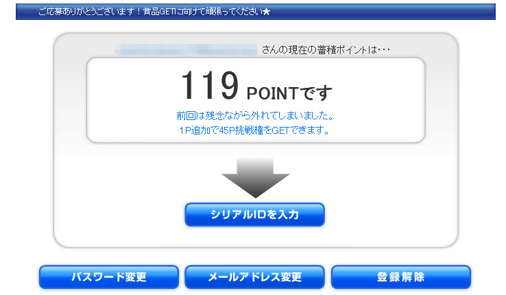 貯めたポイントによってDVDレコーダーやPS3、デジカメなどが当たるというシリアル系の懸賞です。